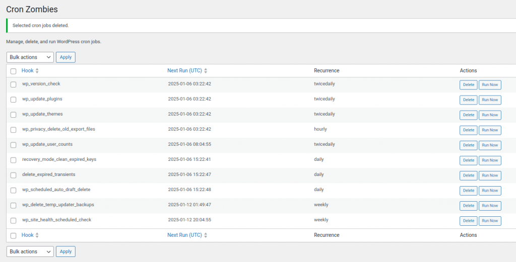 | wp_site_health_scheduled_check | 2025-01-12 20:04:55 | 6 days 16 hours | 1 week |
